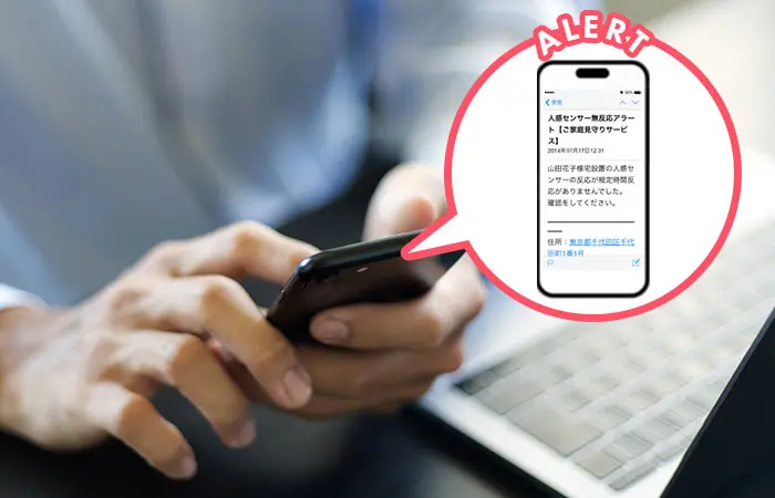 毎⽇、午前9時のタイミングで過去24時間連続して「お部屋の動き」を感知しなかった時、異常(アラート)として事前登録した⽅(⾒守り者)にメール通知するサービスです。※希望により、確認時間数を変更することも可能です(12時間単位)